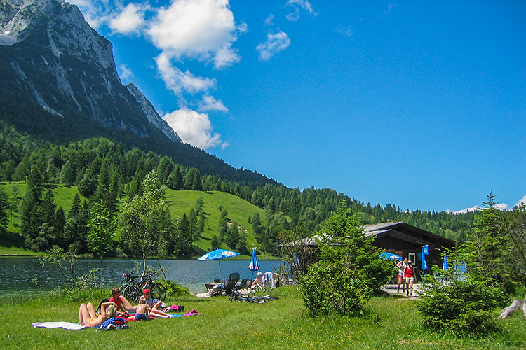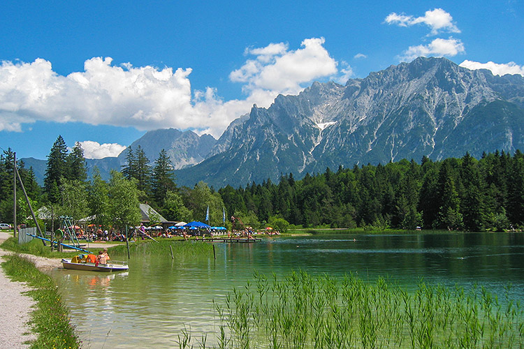 View of the swimming area at the lake Lautersee with the Karwendel behind