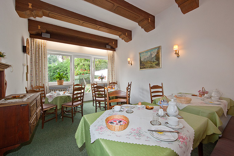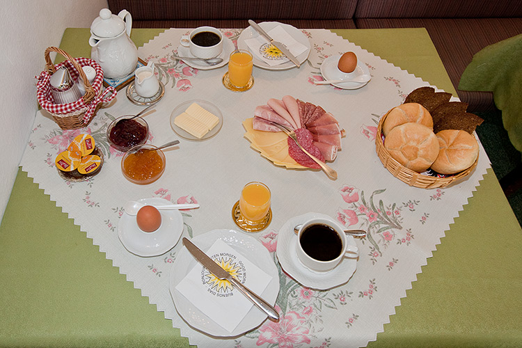 In unserem gemütlichen Frühstücksraum (siehe Bild links) servieren wir Ihnen ein reichhaltiges Frühstück, damit Sie den Tag gut gestärkt beginnen können.